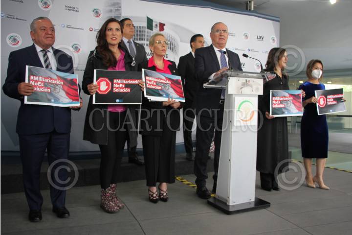 CIUDAD DE MÉXICO, 07SEPTIEMBRE2022.- El senador Julen Rementería, coordinador del grupo parlamentario del PAN, acompañado de senadores, ofreció una conferencia de prensa para protestar en contra de la militarización del país, en el Patio del Federalismo. FOTO: GRACIELA LÓPEZ / CUARTOSCURO.COM