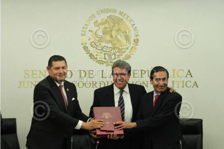 CIUDAD DE MÉXICO, 08SEPTIEMBRE2022.- Rogelio Ramírez de la O, secretario de Hacienda y Crédito Público, entregó el paquete económico 2023 a Ricardo Monreal, coordinador del grupo parlamentario de Morena y a Alejandro Armenta, presidente de la mesa directiva de la Cámara de Senadores, en la sala de JUCOPO del Senado de la República. FOTO: GRACIELA LÓPEZ /CUARTOSCURO.COM