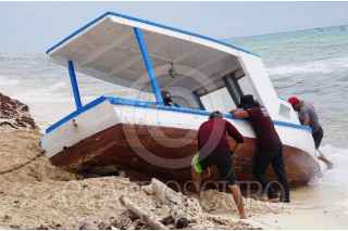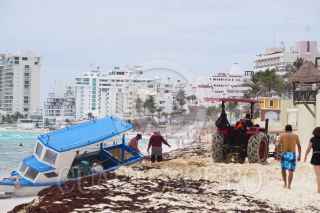 CANCÚN, QUINTANA ROO, 09SEPTIEMBRE2022.- Trabajadores del Ayuntamiento intentaron mover una embarcación abandonada encontrada el día de ayer en las orillas de Playa Delfines. Según testigos del navío hechizo bajaron varias personas y se presume sean indocumentados. FOTO: ELIZABETH RUÍZ /CUARTOSCURO.COM