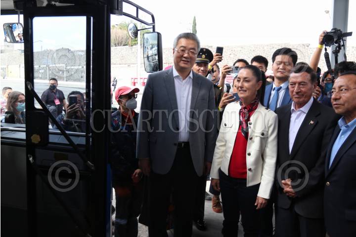 CIUDAD DE MÉXICO, 11SEPTIEMBRE2022.- Claudia Sheinbaum Pardo, jefa de Gobierno de la Ciudad acompañada de Zhu Qingqiao, embajador de China en México; Clara Brugada, alcaldesa de Iztapalapa y Andrés Lajous, secretario de SEMOVI, durante el Inicio de pruebas operativas del Trolebús elevado Ciudad de México que recorre 8 kilómetros en la Alcaldía Iztapalapa. FOTO: ANDREA MURCIA/CUARTOSCURO.COM