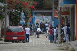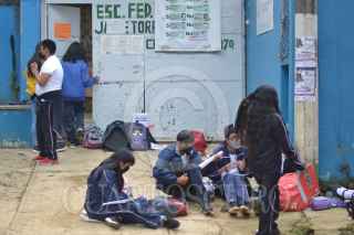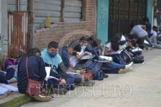 XALAPA, VERACRUZ, 13SEPTIEMBRE2022.- Alumnos de la Telesecundaria “Jaime Torres Bodet” toman clases en las banquetas, mientras padres de familia dialogan con autoridades para exigir la reubicación del plantel, pues señalan que en el interior hay un hundimiento que pone en peligro a los estudiantes. FOTO: YERANIA ROLÓN/CUARTOSCURO.COM