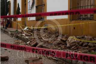 SAN CRISTÓBAL DE LAS CASAS, CHIAPAS, 13SEPTIEMBRE2022.- Las lluvias constantes en la región ocasionaron que la fachada de las oficinas del Sistema Nacional para el Desarrollo Integral de la Familia DIF municipal se dañara, las autoridades municipales colocaron una cinta alrededor del edificio. FOTO: ISABEL MATEOS/CUARTOSCURO.COM