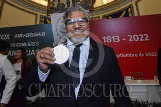CHILPANCINGO, GUERRERO, 14SEPTIEMBRE2022.- De manos de la gobernadora, Evelyn Salgado Pineda, el actor guerrerense Dagoberto Gama Sánchez recibió la presea 'Sentimientos de la Nación', mismo que diera vida al general José María Morelos y Pavón en la película de la vida del que declarará la Independencia de México. Dicha presea fue entregada en la catedral de Santa María de la Asunción, lugar donde el mismo General Morelos firmara los Sentimientos de la Nación. Durante su discurso, Dagoberto Gama agradeció el reconocimiento y honor que le otorgaron los diputados del Congreso guerrerense, así como a su familia y pidió a todos los ciudadanos la unión en independencia en estos tiempos de violencia. Así también, dirigiéndose al representante del Presidente Andrés Manuel López Obrador, pidió la creación de un fondo para apoyar a los actores, como el fondo de apoyo a periodistas, indicando que también el sector actoral está en un abandono. FOTO: DASSAEV TÉLLEZ ADAME/CUARTOSCURO.COM