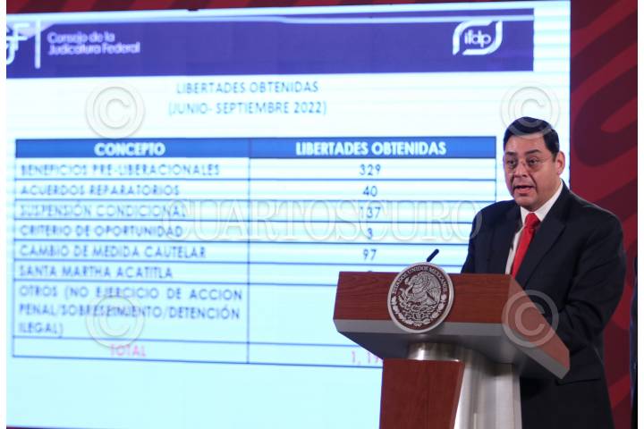 CIUDAD DE MÉXICO, 15SEPTIEMBRE2022.- Andrés Manuel López Obrador, presidente de México acompañado de Rosa Icela Rodríguez Velázquez, secretaria de Seguridad y Protección Ciudadana; Ricardo Mejía Berdeja, subsecretario de Seguridad Pública de la Secretaría de Seguridad y Protección Ciudadana (SSPC) y Carlos Antonio Alpizar Salazar, Secretario General de la Presidencia del Consejo de la Judicatura Federal durante conferencia matutina con tema de Seguridad que se lleva a cabo en Palacio Nacional. FOTO: ANDREA MURCIA /CUARTOSCURO.COM