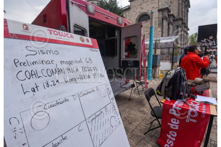 TOLUCA, ESTADO DE MÉXICO, 19SEPTIEMBRE2022.- Media hora después de haber culminado el simulacro de sismo en la ciudad de Toluca se registró un movimiento con magnitud 7.4 con epicentro al sur de Coalcoman, Michoacán, ciudadanos de Toluca evacuaron edificios, oficinas y comercios de la zona centro para colocarse en un lugar seguro mientras se desarrollaba el sismo, las brigadas de PC realizaron la inspección de edificios para descartar algún peligro. Algunas personas trataron de localizar a sus familiares para saber que se encontraban bien. Dos personas fueron atendidas por crisis nerviosa. FOTO: CRISANTA ESPINOSA AGUILAR /CUARTOSCURO.COM