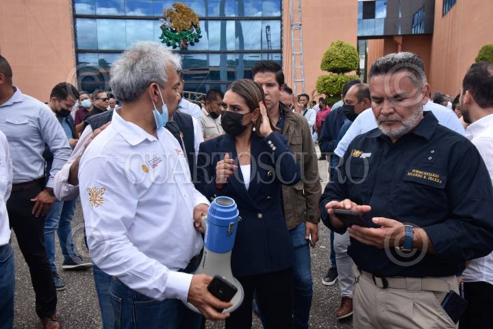 CHILPANCINGO, GUERRERO, 19SEPTIEMBRE2022.- Minutos después del simulacro nacional de sismo realizado a las 12:29 del día de este lunes, un temblor real de una magnitud preliminar 7.4 sacudió al estado de Guerrero, por lo que miles de personas evacuaron edificios públicos y privados. El epicentro se produjo alrededor de las 13:05 horas a 63 kilómetros al sur de Coalcoman, en el vecino estado de Michoacán, sin embargo, se percibió fuerte en Guerrero. En el caso de Chilpancingo, tras la activación de la alarma sísmica, en el Recinto del Poder Ejecutivo cientos de trabajadores evacuaron sus oficinas. Se notó crisis crisis nerviosa y llanto entre algunas mujeres mayores de edad. FOTO: DASSAEV TÉLLEZ ADAME/CUARTOSCURO.COM