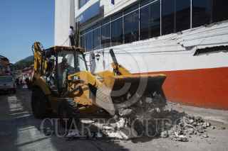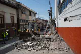URUAPAN, MICHOACÁN, 22SEPTIEMBRE2022.- Tres inmuebles en el centro de Uruapan, Michoacán quedaron dañados tras el sismo de magnitud 6.9 grados Richter ocurrido durante la madrugada de este jueves, sin que haya víctimas mortales. Protección Civil Municipal confirmó daños materiales en el centro de la ciudad: caída de un poste de Teléfonos de México, en la esquina de Emilio Carranza y 20 de noviembre. A pesar de todo, la estructura no presenta daño estructural, solamente la caída de mampostería. FOTO: JUAN JOSÉ ESTRADA SERAFÍN/CUARTOSCURO.COM