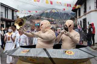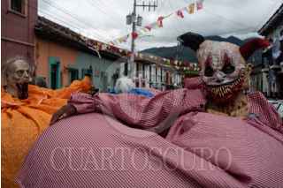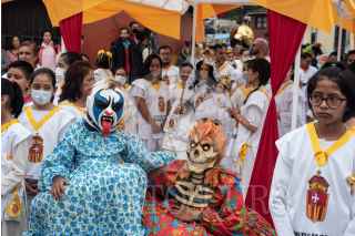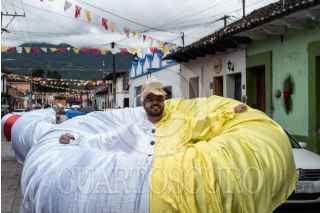 SAN CRISTÓBAL DE LAS CASAS, CHIAPAS, 22SEPTIEMBRE2022.- Después de suspender por dos años consecutivos el desfile debido a la pandemia por Covid 19, el barrio de La Merced dió el anuncio de que celebrará su tradicional fiesta en dedicada a la virgen de La Merced. Los panzudos vestidos con grandes telas de colores y máscaras escalofriantes salen nuevamente a las calles acompañando a la virgen y sus carros alegóricos por las principales calles de la ciudad, siendo este el inicio de la gran fiesta que se llevará a cabo hasta el 24 de septiembre. FOTO: ISABEL MATEOS /CUARTOSCURO.COM