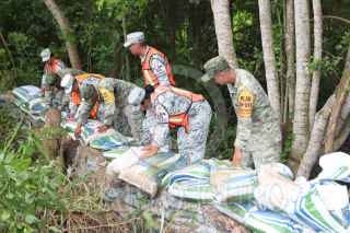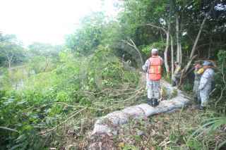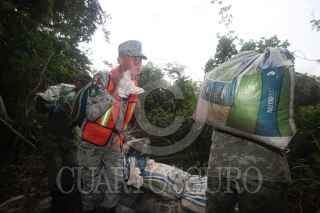 VILLAHERMOSA, TABASCO, 25SEPTIEMBRE2022.- Elementos castrense de la 30 Zona Militar del Ejército Mexicano y de la Guardia Nacional aplican el Plan DN-E-III, colocando costales con arena, ante la crecida del afluente del rio Grijalva, en las inmediaciones del poblado El Zapote, municipio Centro. Pobladores de esta demarcación dieron a conocer que hay miedo por eminente desborde, que en algunos puntos está a ocho centímetros del nivel de desbordamiento. FOTO: CARLOS CANABAL/CUARTOSCURO.COM