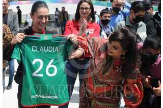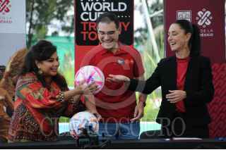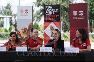 CIUDAD DE MÉXICO, 26SEPTIEMBRE2022.- Claudia Sheinbaum, jefa de gobierno de la capital, encabezó la conferencia de prensa donde se anunció que la Copa del Mundo de la FIFA visitará la capital y será albergada en la Alcaldía Iztapalapa, exactamente en la Utopía de dicha demarcación, el trofeo estará presente en la Ciudad los próximos 15 y 16 de octubre, la mandataria local estuvo acompañada por la alcaldesa Clara Brugada y directivos de la empresa Coca Cola. FOTO: DANIEL AUGUSTO /CUARTOSCURO.COM