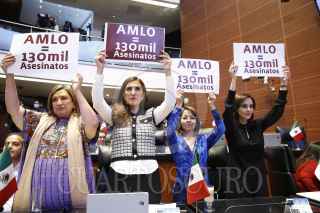 CIUDAD DE MÉXICO, 27SEPTIEMBRE2022.- Las senadoras panistas Xóchitl Gálvez, Kenia López Rabadán, Minerva Hernández, y Lilly Téllez, mostraron una pancartas con la leyenda "AMLO=130 mil asesinatos", durante la sesión en el Senado. FOTO: CUARTOSCURO.COM