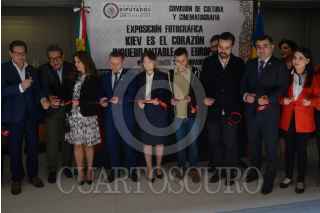 CIUDAD DE MÉXICO, 29SEPTIEMBRE2022.- Volodymyr Kabachenko diputado del parlamento Ucrania; César Agustín Hernandez vicepresidente grupo amistad Mexico-Ucrania; Oksana Dramarétska, embajadora de Ucrania en México; Jorge Álvarez Máynez, coordinador de Movimiento Ciudadano; y Salomón Chertorivski Woldemberg diputado Movimiento Ciudadano, encabezaron la inauguración de la exposición fotográfica "Kiev es el corazón inquebrantable de Europa" en la Cámara de Diputados. FOTO: MARIO JASSO/CUARTOSCURO.COM