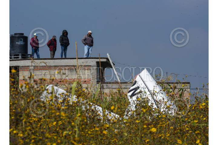 OTZOLOTEPEC, ESTADO DE MÉXICO,30SEPTIEMBRE2022.- Una aeronave se accidentó en la colonia Guadalupe Victoria en el municipio de Otzolotepec frente al panteón delegacional, muy cerca del Aeropuerto Internacional de Toluca (AIT) hasta el momento se tiene conocimiento de tres personas muertas, la zona se encuentra acordonada por policías municipales, Guardia Nacional y Ejército, durante el trabajo de personal de la FGJEM. FOTO: CRISANTA ESPINOSA AGUILAR /CUARTOSCURO.COM