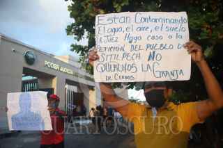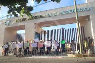 MÉRIDA, YUCATÁN, 04OCTUBRE2022.- Desde las 6 de la mañana, pobladores de la comisaría de Sitilpech, perteneciente al municipio de Izamal "clausuraron" la entrada principal de las oficinas del Poder Judicial de la Federación de Mérida en protesta ante la posibilidad de que este día el Juez Primero, Adrián Fernando Novelo Pérez, levante la suspensión temporal de la granja porcícola ubicada en dicha localidad. Desde abril de este año, se suspendió el permiso de agua de Productos Pecuarios para Consumo, la cual es aparcería de Keken. La gente ha vivido algunos meses sin la pestilencia y agua contaminada pero ahora la Comisión Nacional del Agua, CONAGUA, otorgó nuevos permisos para que se habiliten más pozos en dicha Granja por lo que los pobladores temen que continúen con la cría y engorda de casi 50 mil cerdos al mes. FOTO: MARTÍN ZETINA/CUARTOSCURO.COM