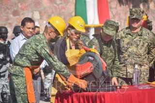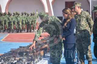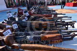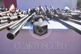 CHILPANCINGO, GUERRERO, 04OCTUBRE2022.- Elementos de la 35 zona militar con sede en Chilpancingo destruyeron 409 armas largas y cortas decomisadas que fueron utilizadas en hechos criminales y que diversos jueces pusieron a disposición de la Secretaría de la Defensa Nacional (Sedena). La destrucción fue encabezada por el comandante de la 35 Zona Militar, Enrique Martínez López, y la gobernadora Evelyn Salgado Pineda, en la explanada del 50 Batallón de Infantería. El general Enrique Martínez informó que se destruyeron 227 armas largas y 182 cortas, entre las que destacan un rifle barret, y lanza granadas. FOTO: DASSAEV TÉLLEZ ADAME/CUARTOSCURO.COM