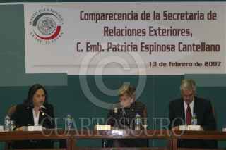 MEXICO, D.F. 13FEBRERO2007.- Patricia Espinosa Castellano durante la comparecencia ante representantes de fracciones parlamentarias de senadores en la cede alterna de la camara alta. FOTO: SAÚL LÓPEZ ESCORCIA/CUARTOSCURO.COM