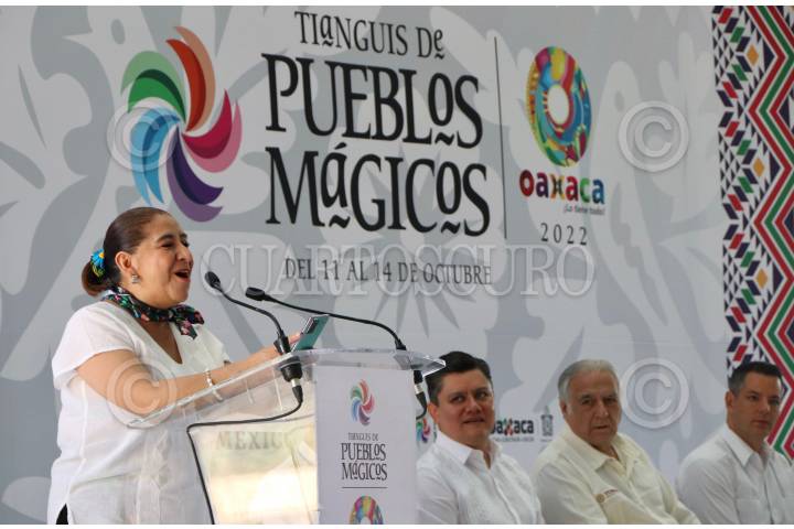 SANTA LUCÍA DEL CAMINO, OAXACA, 13OCTUBRE2022.- El secretario de Turismo del gobierno federal, Miguel Torruco Márquez, el gobernador de Oaxaca, Alejandro Murat Hinojosa, y la secretaria de Turismo de Hidalgo, Elizabeth Quintanar Gómez, encabezaron la ceremonia de pase de estafeta de Oaxaca a Hidalgo, entidad que será sede el próximo año del 5º Tianguis de Pueblos Mágicos. FOTO: CAROLINA JIMÉNEZ/CUARTOSCURO.COM