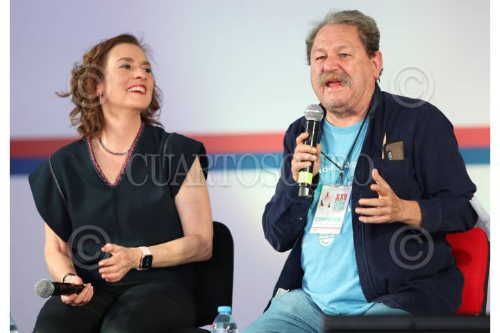 CIUDAD DE MÉXICO, 13OCTUBRE2022.- Beatriz Gutiérrez Müller y Paco Ignacio Taibo ll, titular del Fondo de Cultura Económica ofrecieron la charla “El placer de leer” como parte de las actividades en el marco de la XXII Feria Internacional del Libro en el Zócalo Capitalino. FOTO: ANDREA MURCIA /CUARTOSCURO.COM
