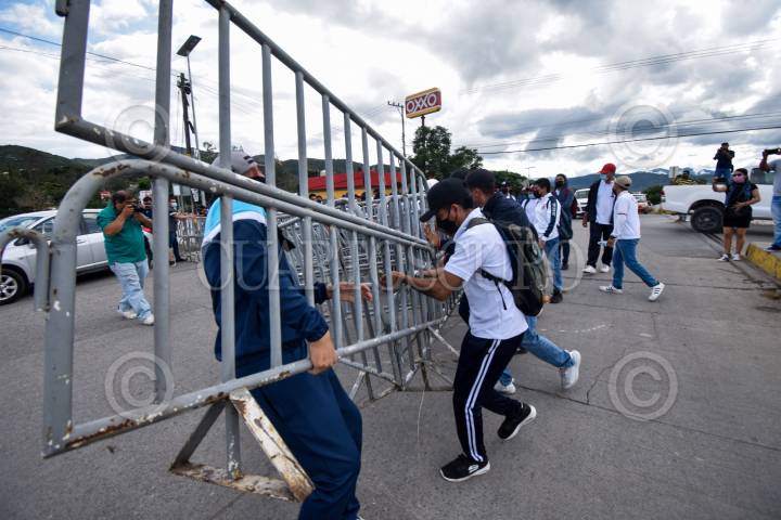 CHILPANCINGO, GUERRERO, 14OCTUBRE2022.- Integrantes del Frente Unido de Normales Públicas del Estado de Guerrero (FUNPEG) bloquearon los carriles centrales del bulevar Vicente Guerrero, las laterales de esta vialidad que conecta con la Autopista del Sol, también mantuvieron bloqueada la circulación sobre el bulevar Alejandro Cervantes Delgado a la altura del Tecnológico, y metros más adelante, a las afueras de Palacio de Gobierno. Alrededor de mil estudiantes de las ocho normales públicas iniciaron su marcha desde el monumento a Las Banderas al sur de la capital con dirección a la sede del Poder Ejecutivo. A su llegada al también conocido como la Casa del Pueblo, los estudiantes retiraron las vallas que el gobierno estatal colocó, previo al informe de la gobernadora que se llevará a cabo el día lunes. Los jóvenes portaban pancartas en las que de leía «No al recorte presupuestal de las normales», «Cumplimiento al pliego petitorio», entre otras. Los normalistas decidieron bloquear el bulevar para presionar una reunión con autoridades del Gobierno estatal encabezada por el secretario General de Gobierno, Ludwig Marcial Reynoso. El secretario de Educación Marcial Rodríguez Saldaña acudió a la protesta afuera del recinto del Poder Ejecutivo para dialogar con los estudiantes y ofrecerles una mesa de trabajo, a la que los jóvenes se negaron, solicitando la presencia del Secretario de Gobierno y de la Gobernadora. Al no tener respuesta a su demanda, se dividieron en grupos para colapsar la circulación en la zona sur de la ciudad. Durante el bloqueo hubo confrontación con algunos automovilistas que quedaron atrapados, quienes amenazaron con aventar los coches a los manifestantes. Poco antes de las 2:30 de la tarde, se instaló una mesa de negociación en la explanada del auditorio Sentimientos de la Nación entre los alumnos y en la que participó el Subsecretario de Finanzas de la SEG Alejandro Moreno Lira, el Subsecretario de Educación Media Su