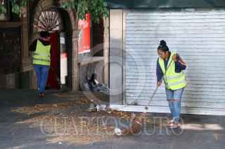 CUERNAVACA, MORELOS, 16OCTUBRE2022.-Dos trabajadoras de limpieza barren la plaza de armas de Cuernavaca. FOTO: MARGARITO PÉREZ RETANA/ CUARTOSCURO.COM
