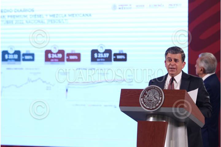 CIUDAD DE MÉXICO, 17OCTUBRE2022.-Andrés Manuel López Obrador, presidente de México acompañado de Jorge Nuño Lara, subsecretario de Infraestructura de la Secretaría de Infraestructura, Comunicaciones y Transportes y Ricardo Sheffield Padilla, titular de la Procuraduría Federal del Consumidor (Profeco) durante la conferencia matutina en Palacio Nacional. FOTO: ANDREA MURCIA /CUARTOSCURO.COM