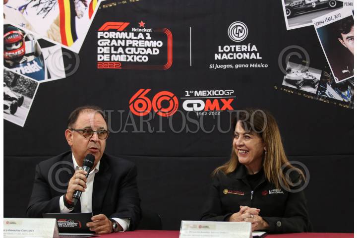 CIUDAD DE MÉXICO, 17OCTUBRE2022.- Federico González Compeán, director General de la Fórmula 1 Gran Premio; Margarita Saravia Calderón, directora general de la Lotería Nacional, durante la presentación del Sorteo especial por el 60º Aniversario del Gran Premio de México. Se imprimieron dos millones cuatrocientos mil billetes con 20 imágenes los cuales ya se pueden adquirir en puestos. FOTO: ANDREA MURCIA /CUARTOSCURO.COM