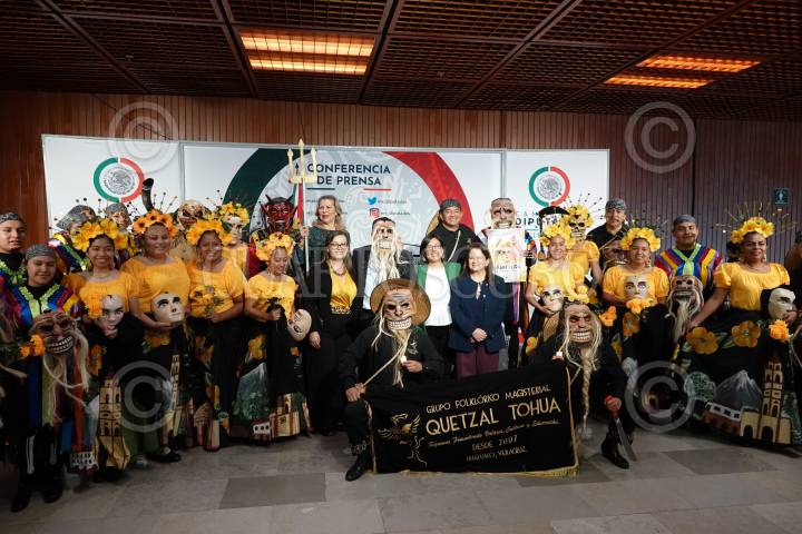 CIUDAD DE MÉXICO, 18OCTUBRE2022.- El diputado Sergio Gutiérrez Luna acompañado de integrantes del Grupo Folklórico Magistral “Quetzal Tohua”, ofreció una conferencia de prensa para anunciar en Xantolo en Veracruz para el festejo de Día de Muertos. FOTO: GRACIELA LÓPEZ /CUARTOSCURO.COM