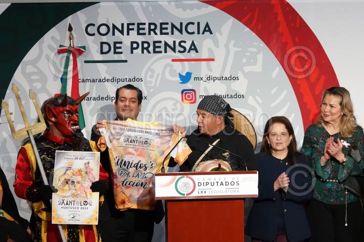 CIUDAD DE MÉXICO, 18OCTUBRE2022.- El diputado Sergio Gutiérrez Luna acompañado de integrantes del Grupo Folklórico Magistral “Quetzal Tohua”, ofreció una conferencia de prensa para anunciar en Xantolo en Veracruz para el festejo de Día de Muertos. FOTO: GRACIELA LÓPEZ /CUARTOSCURO.COM