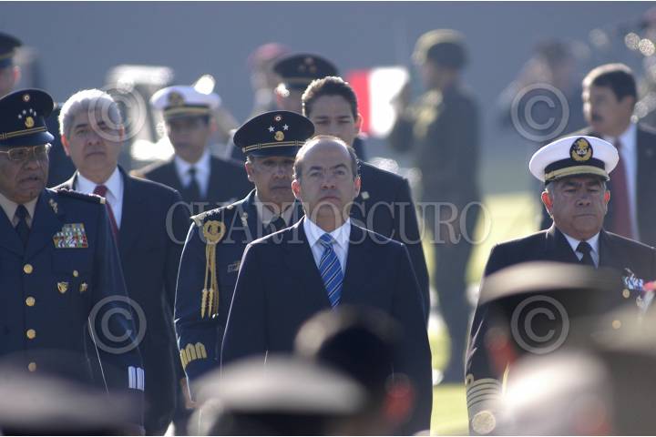 HUEHUETOCA, ESTADO DE MÉXICO 19FEBRERO2007.- El presidente Felipe Calderón Hinojosa, es acompañado del secretario de defensa nacional Guillermo Galvan Galvandurante el desayuno conmemorativo al ¨Día del Ejercito¨ realizado en el campo militar No. 37 . FOTO: GUILLERMO PEREA/CUARTOSCURO.COM