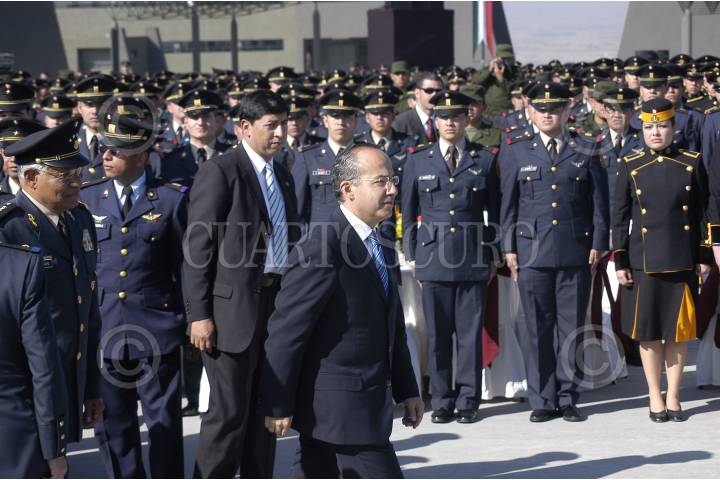 HUEHUETOCA, ESTADO DE MÉXICO 19FEBRERO2007.- El presidente Felipe Calderón Hinojosa, es acompañado del secretario de defensa nacional Guillermo Galvan Galvandurante el desayuno conmemorativo al ¨Día del Ejercito¨ realizado en el campo militar No. 37 . FOTO: GUILLERMO PEREA/CUARTOSCURO.COM