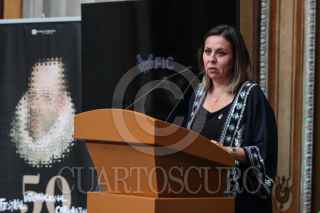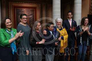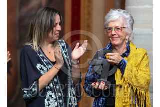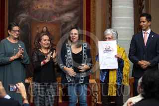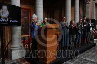 LEÓN, GUANAJUATO, 23OCTUBRE2022.- Mariana Aymerich, directora general del Festival Internacional Cervantino; Cecilia Ramos Estrada, secretaria general de la universidad de Guanajuato; Lucina Jiménez López directora del INBA; Mariana Camarena de Obedo directora General del IEC Guanajuato; Rodrigo Martínez Nieto y Jorge Cabrejos Salame, director de mercadotecnia de la secretaría de turismo del Estado de Guanajuato durante la entrega de la presea Cervantino otorgada a Carmen Parra y que se llevó a cabo en el Teatro Juárez. FOTO: ANDREA MURCIA /CUARTOSCURO.COM