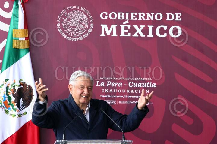 TEPOZTLAN, MORELOS, 23OCTUBRE2022.- Inauguración de la modernización de la autopista La Pera- Cuautla, por el presidente de la república, Andrés Manuel López Obrador, acompañado del gobernador, Cuauhtémoc Blanco. Esta obra inició en el 2011 y provocó el rechazo de una parte de la población por el daño ecológico que causo al medio ambiente al ser ampliada a cuatro carriles. FOTO: MARGARITO PÉREZ RETANA / CUARTOSCURO. COM