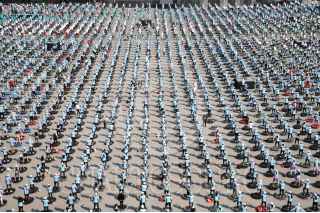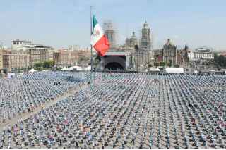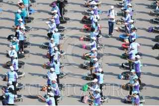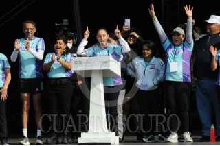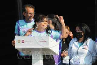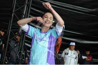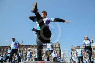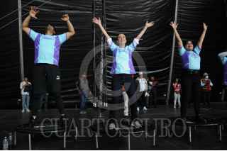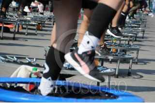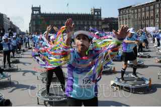 CIUDAD DE MÉXICO, 23OCTUBRE2022.- Claudia Sheinbaum, jefa de gobierno de la capital, acompañada por Clara Brugada, alcaldesa de Iztapalapa, encabezaron la clase masiva de trampolín fitness en busca de romper un récord guines, el evento se llevó a cabo en la explanada del Zócalo. FOTO: DANIEL AUGUSTO /CUARTOSCURO.COM
