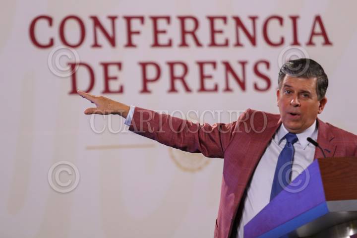 CIUDAD DE MÉXICO, 24OCTUBRE2022.- Andrés Manuel López Obrador, Presidente de México; Ricardo Sheffield Padilla, titular de Profeco, y Jesús Ramírez Cuevas, Vocero de la Presidencia, durante la mañanera, en la que se habló sobre la inflación en la economía del país. FOTO: MOISÉS PABLO/CUARTOSCURO.COM