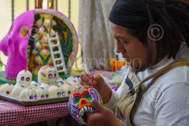TOLUCA, ESTADO DE MÉXICO, 25OCTUBRE2022.- Brandon Rodríguez de Paz a sus 28 años de edad se dedica a elaborar dulce de Alfeñique y vaciado de Azúcar, es la tercera generación en su familia que se dedica a esto, con 70 años de historia, aprendió de su abuela y su tía. La elaboración del dulce de Alfeñique y calaveras de azúcar es un proceso largo y laborioso, en el cual inician a trabajar en los mésese de febrero o marzo y al término de Semana Santa en algunos casos. Con el aumento de los insumos como el gas, azúcar, entre otros ha sido un reto para quienes se dedican a elaborar estos dulces, representando un golpe en su economía, y para poder tener alguna ganancia tienen que nivelar los precios. Este año con la instalación de más días de la Feria del Alfeñique en la capital mexiquense aumentaron su producción un 20 por ciento, en comparación a su producción durante la Pandemia por COVID-19, ya que no quieren arriesgar el no poder colocar su producto. Unas de las calaveras de azúcar que trabaja Brandon se caracterizan por el diseño que muestran, aparte de la tradicional calavera, buscando innovar y e implementando técnicas como de cerámica y pintura, ya que el azúcar puede ser manipulada de diversas formas. Invita a las familias a que se acerquen y disfruten los diversos productos que se ofrecen en la Feria del Alfeñique en Toluca en donde se encuentran presentes los artesanos. FOTO: CRISANTA ESPINOSA AGUILAR /CUARTOSCURO.COM
