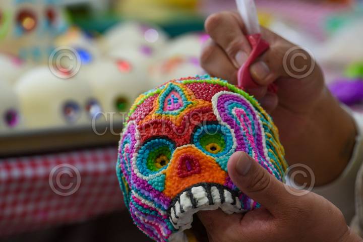 TOLUCA, ESTADO DE MÉXICO, 25OCTUBRE2022.- Brandon Rodríguez de Paz a sus 28 años de edad se dedica a elaborar dulce de Alfeñique y vaciado de Azúcar, es la tercera generación en su familia que se dedica a esto, con 70 años de historia, aprendió de su abuela y su tía. La elaboración del dulce de Alfeñique y calaveras de azúcar es un proceso largo y laborioso, en el cual inician a trabajar en los mésese de febrero o marzo y al término de Semana Santa en algunos casos. Con el aumento de los insumos como el gas, azúcar, entre otros ha sido un reto para quienes se dedican a elaborar estos dulces, representando un golpe en su economía, y para poder tener alguna ganancia tienen que nivelar los precios. Este año con la instalación de más días de la Feria del Alfeñique en la capital mexiquense aumentaron su producción un 20 por ciento, en comparación a su producción durante la Pandemia por COVID-19, ya que no quieren arriesgar el no poder colocar su producto. Unas de las calaveras de azúcar que trabaja Brandon se caracterizan por el diseño que muestran, aparte de la tradicional calavera, buscando innovar y e implementando técnicas como de cerámica y pintura, ya que el azúcar puede ser manipulada de diversas formas. Invita a las familias a que se acerquen y disfruten los diversos productos que se ofrecen en la Feria del Alfeñique en Toluca en donde se encuentran presentes los artesanos. FOTO: CRISANTA ESPINOSA AGUILAR /CUARTOSCURO.COM