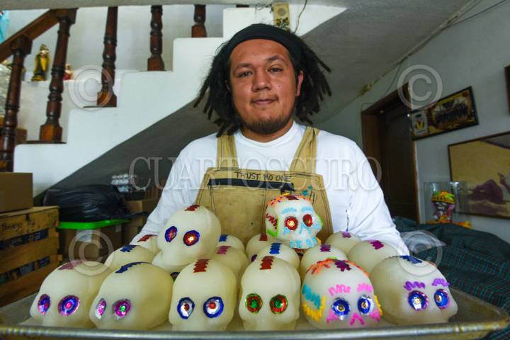 TOLUCA, ESTADO DE MÉXICO, 25OCTUBRE2022.- Brandon Rodríguez de Paz a sus 28 años de edad se dedica a elaborar dulce de Alfeñique y vaciado de Azúcar, es la tercera generación en su familia que se dedica a esto, con 70 años de historia, aprendió de su abuela y su tía. La elaboración del dulce de Alfeñique y calaveras de azúcar es un proceso largo y laborioso, en el cual inician a trabajar en los mésese de febrero o marzo y al término de Semana Santa en algunos casos. Con el aumento de los insumos como el gas, azúcar, entre otros ha sido un reto para quienes se dedican a elaborar estos dulces, representando un golpe en su economía, y para poder tener alguna ganancia tienen que nivelar los precios. Este año con la instalación de más días de la Feria del Alfeñique en la capital mexiquense aumentaron su producción un 20 por ciento, en comparación a su producción durante la Pandemia por COVID-19, ya que no quieren arriesgar el no poder colocar su producto. Unas de las calaveras de azúcar que trabaja Brandon se caracterizan por el diseño que muestran, aparte de la tradicional calavera, buscando innovar y e implementando técnicas como de cerámica y pintura, ya que el azúcar puede ser manipulada de diversas formas. Invita a las familias a que se acerquen y disfruten los diversos productos que se ofrecen en la Feria del Alfeñique en Toluca en donde se encuentran presentes los artesanos. FOTO: CRISANTA ESPINOSA AGUILAR /CUARTOSCURO.COM