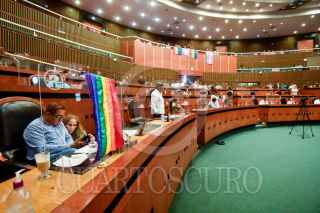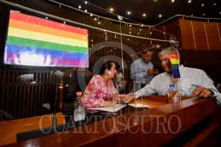 CHILPANCINGO, GUERRERO, 26OCTUBRE2022.- La noche de ayer, con 38 votos a favor, seis en contra y dos nulos, el Congreso local aprobó las reformas al Código Civil y al Código Procesal Civil que permiten el matrimonio entre personas del mismo sexo, lo que fue celebrado por integrantes de la comunidad LGBT. Para los integrantes de la comunidad, lo aprobado es una conquista histórica de los colectivos, sin embargo, la única oradora en contra, Julieta Fernández, diputada priísta y activista ‘ProVida’ y religiosa, advirtió que con pasos como este se pone en riesgo el futuro de las nuevas generaciones. El dictamen de la comisión de justicia derivó de las iniciativas presentadas por el diputado con licencia y actual dirigente estatal de Morena, Jacinto González Varona y Yoloczin Domínguez Serna, actual presidenta de la Junta de Coordinación Política (Jucopo) y complementada por el Ayuntamiento Municipal de Acapulco. El Congreso reformó disposiciones del Código Civil del Estado, número 358 y del Código Procesal Civil del Estado de Guerrero, con el propósito de reconocer en la legislación estatal el matrimonio y concubinato para todas las personas sin discriminación alguna, regulados en ambos códigos. Asimismo, se aprobó la Ley número 495 del Registro Civil del Estado de Guerrero en materia de derechos y obligaciones del matrimonio. De esa manera, jurídicamente se reconoce en la legislación del estado el matrimonio y concubinato para todas las personas sin discriminación alguna, regulados en el Código Civil y Código Procesal Civil. FOTO: DASSAEV TÉLLEZ ADAME/CUARTOSCURO.COM