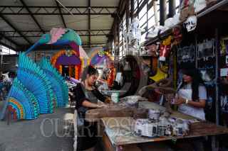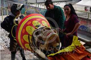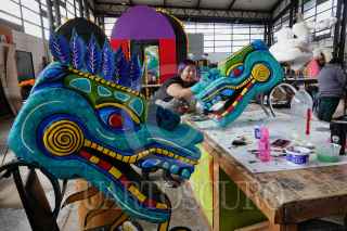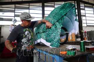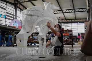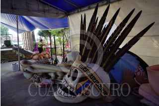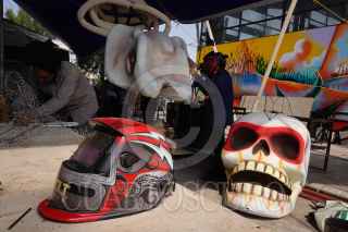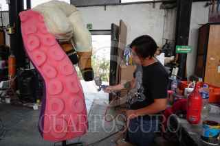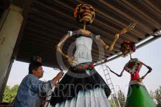CIUDAD DE MÉXICO, 26OCTUBRE2022.- Como parte de los eventos por el Día de Muertos por parte del gobierno, talleristas, trabajadores y voluntarios laboran a marcha forzadas en los preparativos para el Gran Desfile día de Muertos desde los talleres del Faro Oriente en Iztapalapa. Dicho desfile contará con 16 carros alegóricos, 5 globos monumentales y más de mil participantes. FOTO: ROGELIO MORALES /CUARTOSCURO.COM