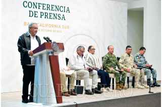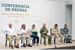 LA PAZ, BAJA CALIFORNIA SUR, 28OCTUBRE2022.- Andrés Manuel López Obrador, presidente de México, encabezó en las primeras horas la conferencia de prensa matutina desde La Paz, Baja California Sur. Lo acompañaron: Víctor Manuel Castro Cosío, gobernador de Baja California Sur; Adán Augusto López Hernández, secretario de Gobernación; Rosa Icela Rodríguez Velázquez, secretaria de Seguridad y Protección Ciudadana; José Rafael Ojeda Durán, secretario de Marina; Luis Cresencio Sandoval González, secretario de la Defensa Nacional y Luis Rodríguez Bucio, comandante de la Guardia Nacional. FOTO: PRESIDENCIA/CUARTOSCURO.COM