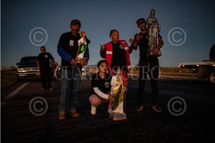 VILLANUEVA, ZACATECAS, 28OCTUBRE2022.- Desde la tarde del 27 de octubre, cientos de devotos de "San Juditas" caminan 66 kilómetros para llegar a la Parroquia de San Judas Tadeo, en el municipio de Villanueva, y festejar el 28 de octubre. Esta año se pudieron observar más peregrinos después de haber sorteado la Pandemia y existir las condiciones de salud para permitir las aglomeraciones en espacios públicos y recintos religiosos. A lo largo de la carretera No 54 Zacatecas-Villanueva, niños, jóvenes y adultos mayores realizaban el recorrido a pie o en bicicleta, llevando la figura física en sus manos, en una playera, en una estampilla, un tatuaje o con un simple escapulario, el santo de los desamparados o causas perdidas. A lo largo del trayecto personas solidarias y también devotas de San Judas, ofrecieron agua, fruta, alimentos y café, para poder soportar el cansancio de la distancia hasta el recinto.A la parroquia llegaban peregrinaciones o personas en lo individual para poder ver la figura del Santo, tocar las figuras, tomarse la fotografía, bendecir sus imágenes con agua bendita y hasta llevar las mañanitas para celebrar al patrono en su día. Sobre la plaza principal y alrededor del jardín se realizaron ventas de figuras y artículos con la figura del festejado, además de venta de comida y la tradicional danza que pobladores realizan en honor a San Judas. FOTO: ADOLFO VLADIMIR /CUARTOSCURO.COM