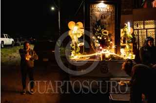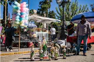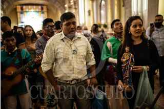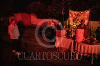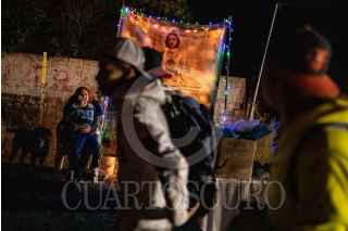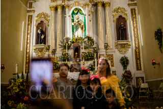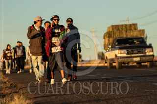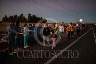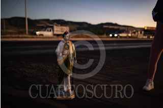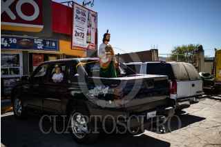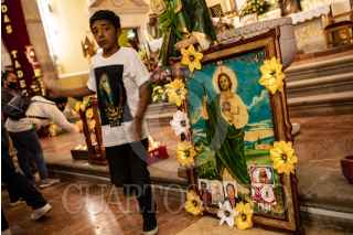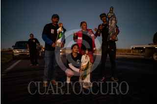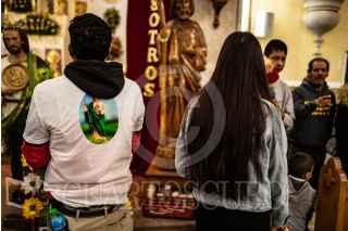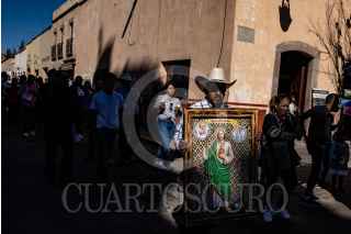 VILLANUEVA, ZACATECAS, 28OCTUBRE2022.- Desde la tarde del 27 de octubre, cientos de devotos de "San Juditas" caminan 66 kilómetros para llegar a la Parroquia de San Judas Tadeo, en el municipio de Villanueva, y festejar el 28 de octubre. Esta año se pudieron observar más peregrinos después de haber sorteado la Pandemia y existir las condiciones de salud para permitir las aglomeraciones en espacios públicos y recintos religiosos. A lo largo de la carretera No 54 Zacatecas-Villanueva, niños, jóvenes y adultos mayores realizaban el recorrido a pie o en bicicleta, llevando la figura física en sus manos, en una playera, en una estampilla, un tatuaje o con un simple escapulario, el santo de los desamparados o causas perdidas. A lo largo del trayecto personas solidarias y también devotas de San Judas, ofrecieron agua, fruta, alimentos y café, para poder soportar el cansancio de la distancia hasta el recinto.A la parroquia llegaban peregrinaciones o personas en lo individual para poder ver la figura del Santo, tocar las figuras, tomarse la fotografía, bendecir sus imágenes con agua bendita y hasta llevar las mañanitas para celebrar al patrono en su día. Sobre la plaza principal y alrededor del jardín se realizaron ventas de figuras y artículos con la figura del festejado, además de venta de comida y la tradicional danza que pobladores realizan en honor a San Judas. FOTO: ADOLFO VLADIMIR /CUARTOSCURO.COM