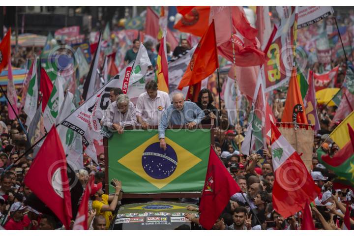Sao Pablo , BRASIL, 29OCTUBRE2022.- Esta tarde se realizó el cierre de campaña del candidato a la presidencia de Brasil, Lula Da Silva, a lo largo de la avenida Paulista, en la ciudad de São Paulo. Al lugar acudieron miles de personas que portaban propaganda a favor de Lula y entonaron cantos y consignas a lo largo del recorrido. Las calles de São Paulo se observaron repletas de banderas con los colores del partido político PT (Partido de los Trabajadores). El candidato, quien previamente estuvo en la presidencia durante el periodo 2003-2011, se vio acompañado por el expresidente de Uruguay, Pepe Mujica, y el ex alcalde de São Paulo, Fernando Haddad. FOTO: OMAR MARTÍNEZ/ CUARTOSCURO.COM - GLOBAL EXCHANGE- TERRA 360