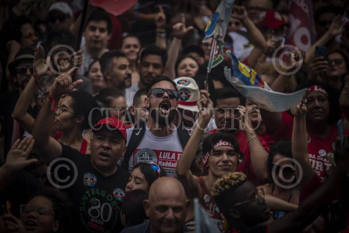 Sao Pablo , BRASIL, 29OCTUBRE2022.- Esta tarde se realizó el cierre de campaña del candidato a la presidencia de Brasil, Lula Da Silva, a lo largo de la avenida Paulista, en la ciudad de São Paulo. Al lugar acudieron miles de personas que portaban propaganda a favor de Lula y entonaron cantos y consignas a lo largo del recorrido. Las calles de São Paulo se observaron repletas de banderas con los colores del partido político PT (Partido de los Trabajadores). El candidato, quien previamente estuvo en la presidencia durante el periodo 2003-2011, se vio acompañado por el expresidente de Uruguay, Pepe Mujica, y el ex alcalde de São Paulo, Fernando Haddad. FOTO: OMAR MARTÍNEZ/ CUARTOSCURO.COM - GLOBAL EXCHANGE- TERRA 360