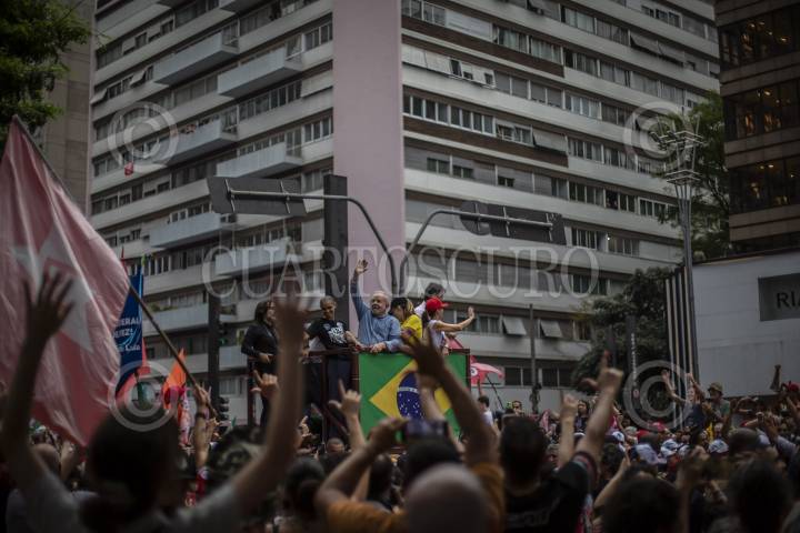 Sao Pablo , BRASIL, 29OCTUBRE2022.- Esta tarde se realizó el cierre de campaña del candidato a la presidencia de Brasil, Lula Da Silva, a lo largo de la avenida Paulista, en la ciudad de São Paulo. Al lugar acudieron miles de personas que portaban propaganda a favor de Lula y entonaron cantos y consignas a lo largo del recorrido. Las calles de São Paulo se observaron repletas de banderas con los colores del partido político PT (Partido de los Trabajadores). El candidato, quien previamente estuvo en la presidencia durante el periodo 2003-2011, se vio acompañado por el expresidente de Uruguay, Pepe Mujica, y el ex alcalde de São Paulo, Fernando Haddad. FOTO: OMAR MARTÍNEZ/ CUARTOSCURO.COM - GLOBAL EXCHANGE- TERRA 360