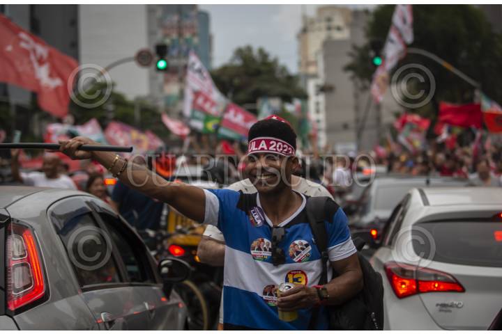 Sao Pablo , BRASIL, 29OCTUBRE2022.- Esta tarde se realizó el cierre de campaña del candidato a la presidencia de Brasil, Lula Da Silva, a lo largo de la avenida Paulista, en la ciudad de São Paulo. Al lugar acudieron miles de personas que portaban propaganda a favor de Lula y entonaron cantos y consignas a lo largo del recorrido. Las calles de São Paulo se observaron repletas de banderas con los colores del partido político PT (Partido de los Trabajadores). El candidato, quien previamente estuvo en la presidencia durante el periodo 2003-2011, se vio acompañado por el expresidente de Uruguay, Pepe Mujica, y el ex alcalde de São Paulo, Fernando Haddad. FOTO: OMAR MARTÍNEZ/ CUARTOSCURO.COM - GLOBAL EXCHANGE- TERRA 360