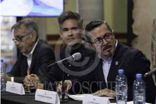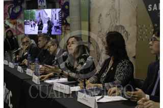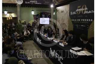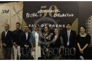 GUANAJUATO, GUANAJUATO, 30OCTUBRE2022.- Ángel Acona, director del Sistema de teatros CDMX; Jorge Cabrejos, director de Mercadotecnia de la Secretaria de Turismo del Estado de Guanajuato; José Osvaldo Chávez, director de Extensión Cultural de la UG; Adriana Camarena de Obeso, directora General del IEC Guanajuato; Mariana Aymerich Ordóñez, directora general del Festival Internacional Cervantino (FIC); Martha Delgado Zárate, secretaria del H. Ayuntamiento; Woo Pyo Jun, director del Centro Cultural Coreano en México; Yeakoo, team leader de Kofice durante la conferencia de cierre del Festival Internacional Cervantino (FIC) en su cincuenta edición que tuvo como país invitado a Corea y a Ciudad de México como Ciudad invitada. No se anuncio invitado para el próximo año aún. FOTO: ANDREA MURCIA /CUARTOSCURO.COM