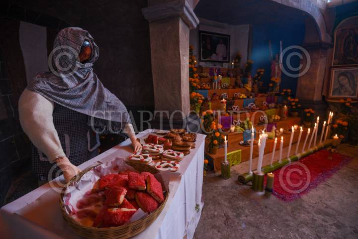 MALINALCO, ESTADO DE MÉXICO, 31 OCTUBRE2022.- Como ya es tradición cada año en el municipio de Malinalco son colocadas las ofrendas para los Muertos Nuevos, sus familias colocan ofrendas monumentales en donde representan los gustos y vida de los difuntos. Estas ofrendas coloridas son visitadas nos solo por locales si no también por turistas sanciónales e internacionales que se maravillan con la dedicación que las familias de este municipio recuerdan a sus muertos, quienes llegan a invertir hasta dos meses en levantar sus ofrendas, los visitantes llevan veladoras o cetas qué significan una luz para el camino del nuevo muerto y la familia da a cambio bebida o comida o algún otro recuerdo en agradecimiento. FOTO: CRISANTA ESPINOSA AGUILAR /CUARTOSCURO.COM