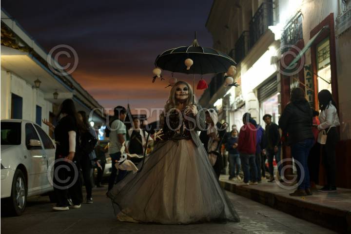 SAN CRISTÓBAL DE LAS CASAS, CHIAPAS, 31OCTUBRE2022.- Cientos de estudiantes de diferentes escuelas de la ciudad, realizaron un desfile disfrazados de catrinas y catrines en las principales calles de la Ciudad. Con disfraces creativos recorrieron el centro entregando dulces y saludos a los espectadores. FOTO: ISABEL MATEOS /CUARTOSCURO.COM