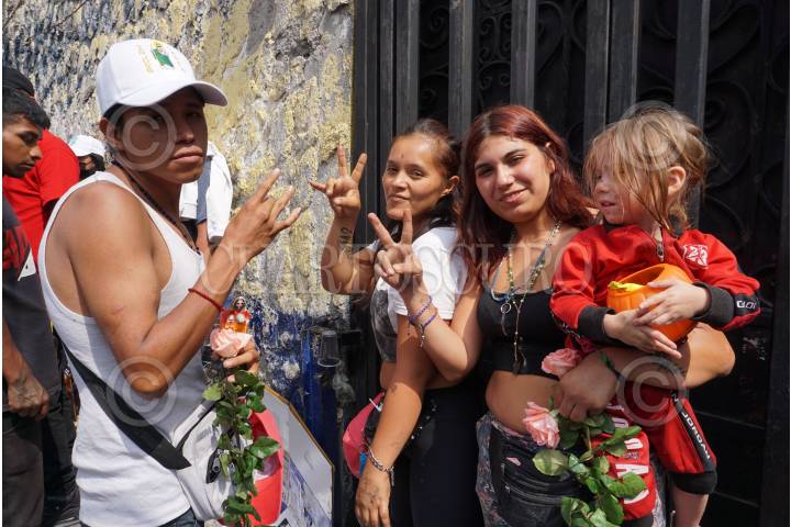 CIUDAD DE MÉXICO, 01NOVIEMBRE2022.- El barrio de Tepito registró una concurrencia de mujeres, niños, jóvenes y adultos mayores cuyo objetivo era llegar o acercarse lo más posible al altar de la Santa Muerte. Cada primero de noviembre cientos de devotos de la también llamada “Niña Blanca” acuden hasta uno de sus altares más populares en la Ciudad de México a visitarla y cumplir sus mandas, llevando ofrendas como alcohol o puros. Los cigarros o puros que se le ofrecen deberán estar encendidos colocados a un lado de ella. Se dice que cuando encienda un cigarro, uno es para uno es para uno mismo y el otro es para la Santa Muerte, esto ayudará a alejar la envidia en torno del trabajo y la familia. En caso de ofrendar un puro deberá encenderlo y fumarlo exhalando el humo directamente a la Santa Muerte, ya que ayudará a que se purifique el altar y se aleje toda energía negativa puede hacerlo las veces que lo crea conveniente. FOTO: ELIZABETH RUIZ/CUARTOSCURO.COM